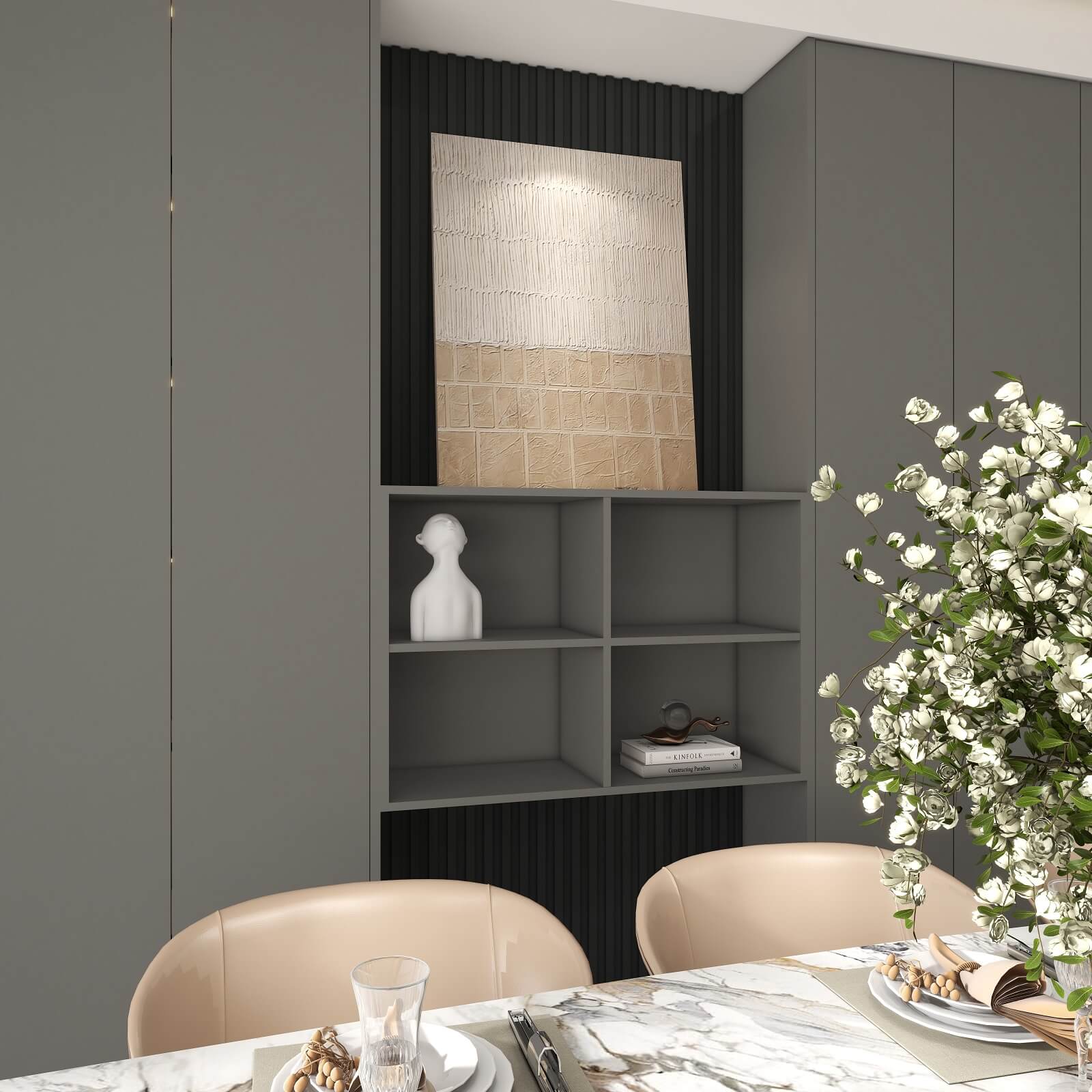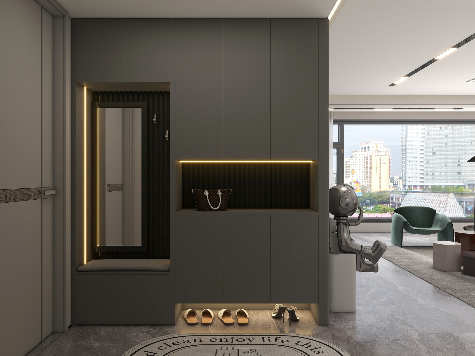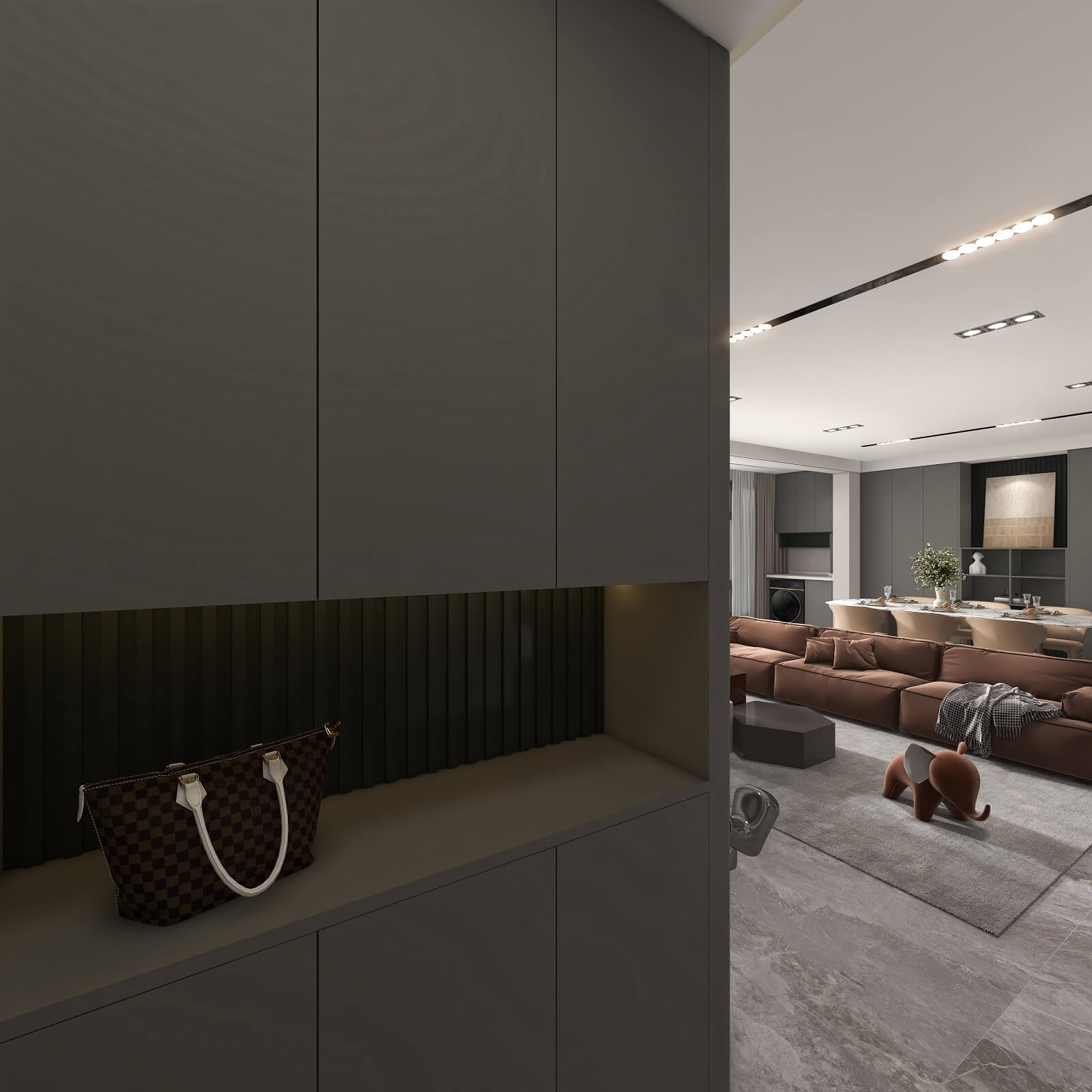 大面積運用深灰色,格柵元素極具設計感,在層板燈的渲染下整個玄關輕奢有內涵,給空間增添了幾分自然純粹的氣息,讓人身心放松。
