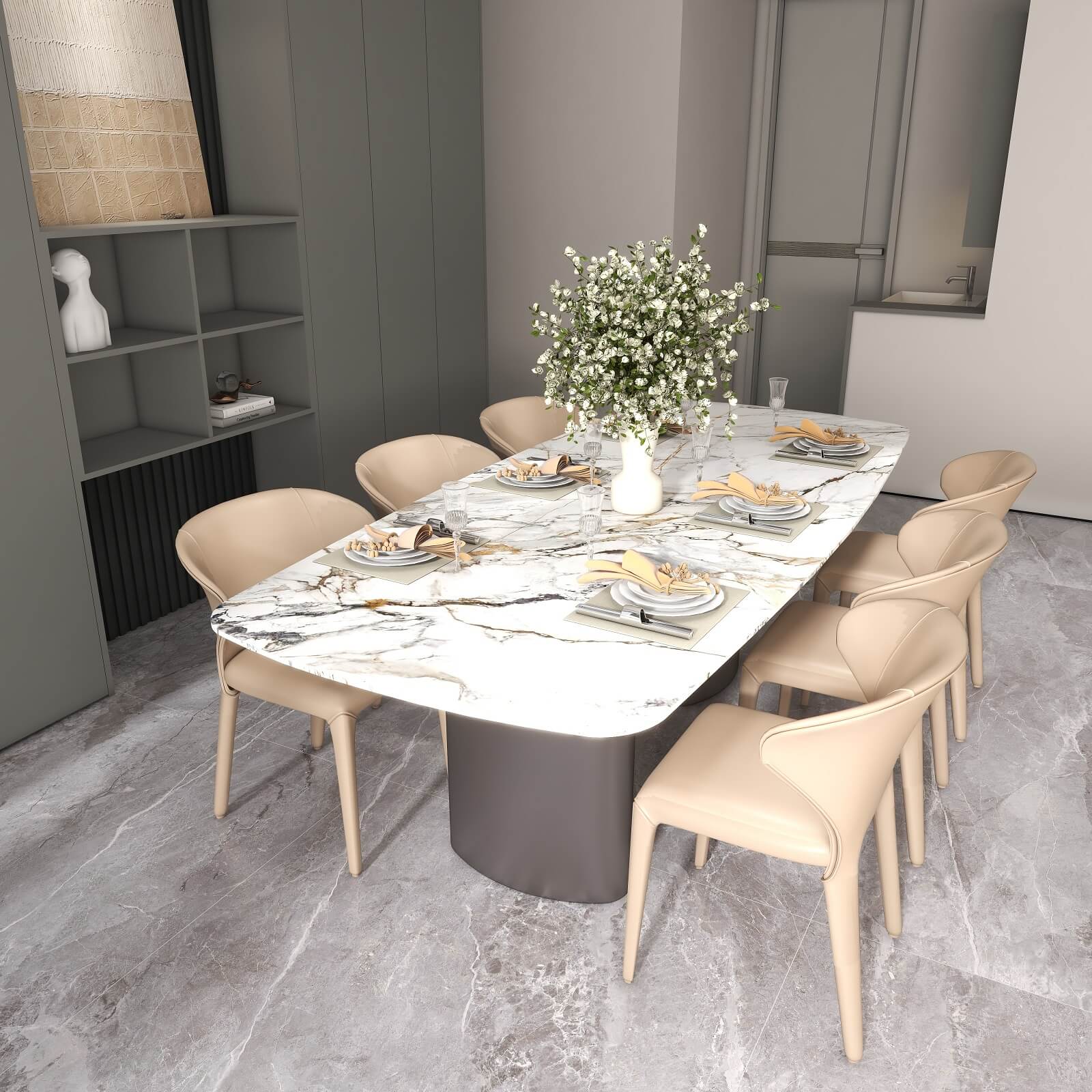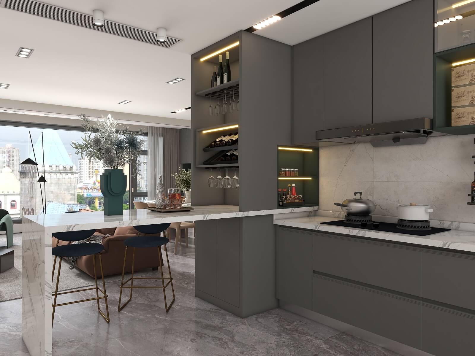 光影流動,木飾面、大理石、木格柵交織出不同層次秩序,給予空間精致質感。