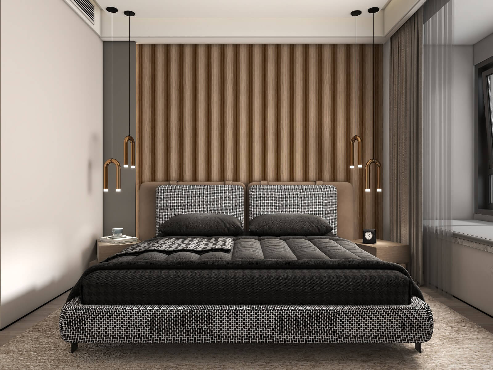 主臥的一切設計,都有助于睡眠氛圍的營造,黑棕色配合沉靜的物件,從材料到觸感,強調事物質樸的內在,能夠展示高端定制木作的本質之美。